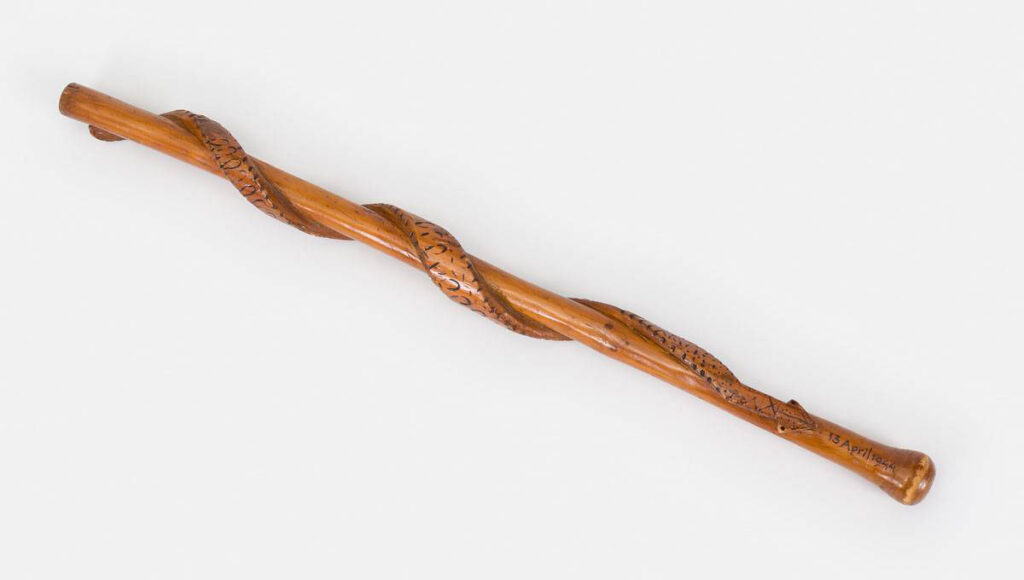 The young Jan Leunis Dop and other village children often went to the camp fence. Using hand gestures and facial expressions, they tried to communicate with the Moroccan men, who did not speak their language but clearly felt their kindness. Sometimes the children passed bits of food through the fence. In return, they received small, handmade gifts. Jan was given a wooden walking stick with a carved snake wrapped around it – a carefully crafted object made with simple tools.
