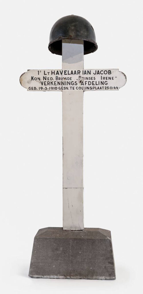 Havelaar was buried the next day in Colijnsplaat, and on 5 August 1945 reinterred in his family grave in Hillegersberg (vault no. 12). A simple wooden grave marker stood on his grave — that very same wooden cross is now part of the museum’s collection. The family has since relinquished the burial rights; in consultation with relatives, the Netherlands War Graves Foundation and other parties, it was decided to transfer Havelaar’s remains back to Colijnsplaat — the place where he fell and where his memory continues to be actively preserved. In the centre of Colijnsplaat, Havelaar Street was named in his honour, and near the church stands a monument featuring a bronze replica of his helmet.